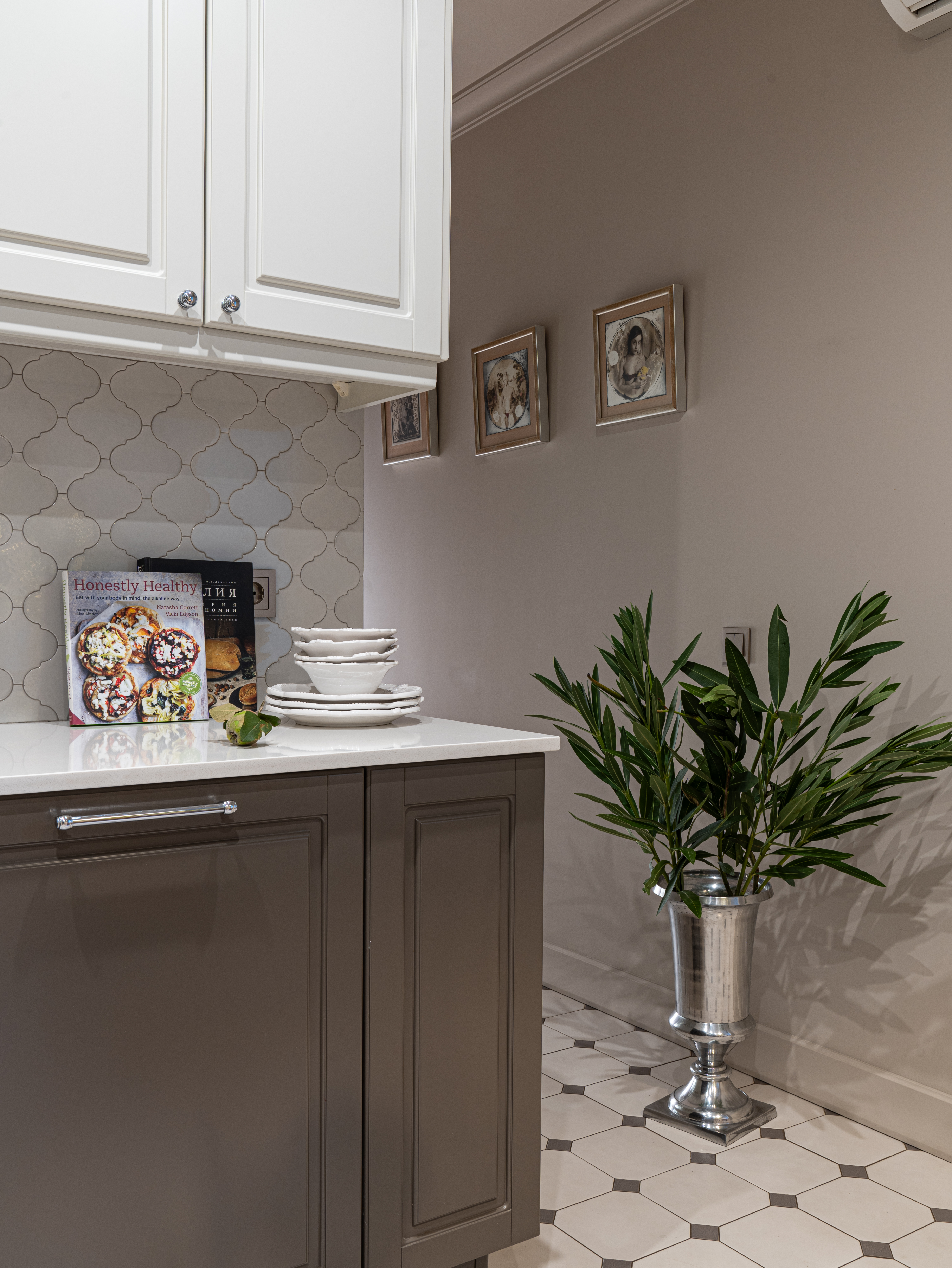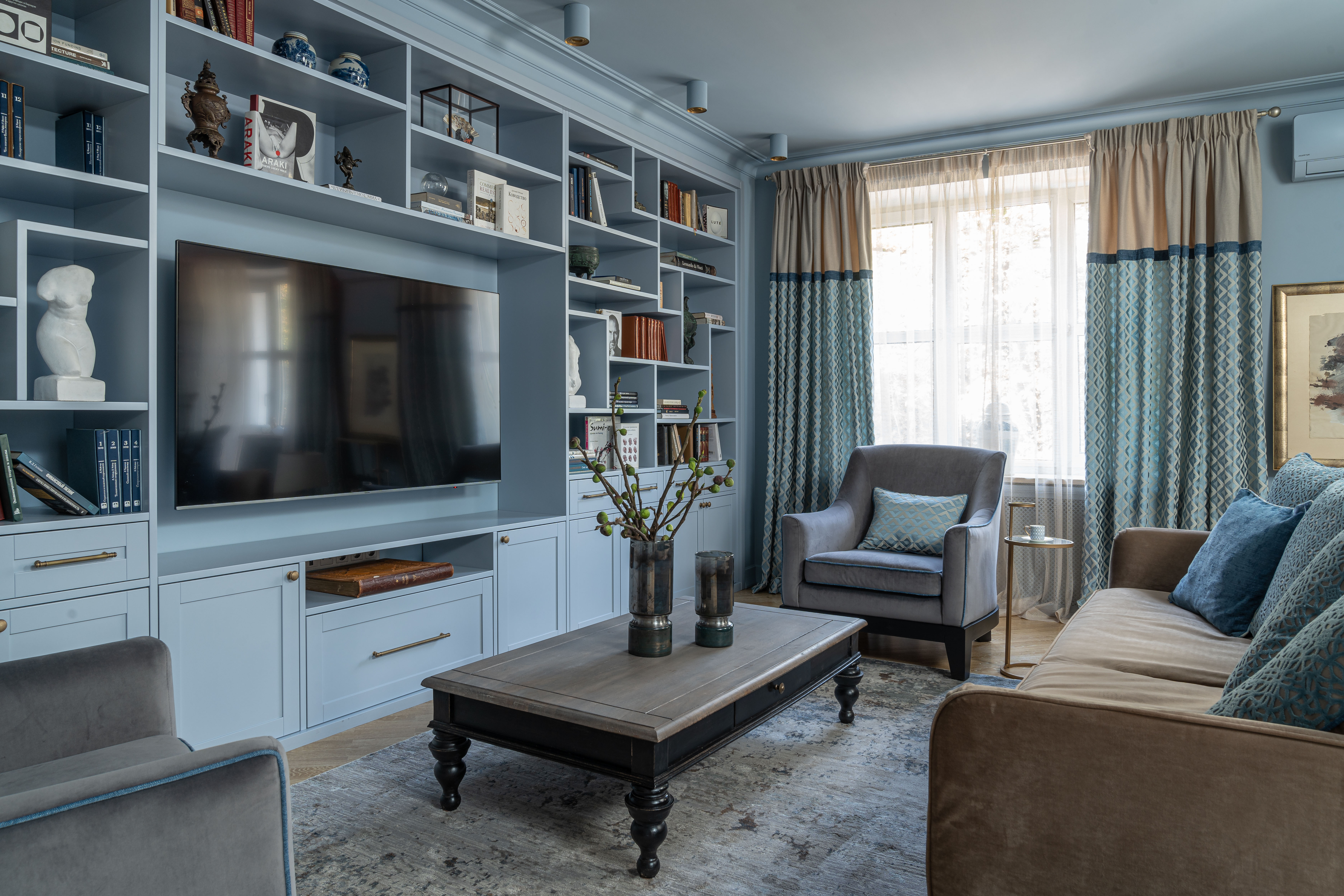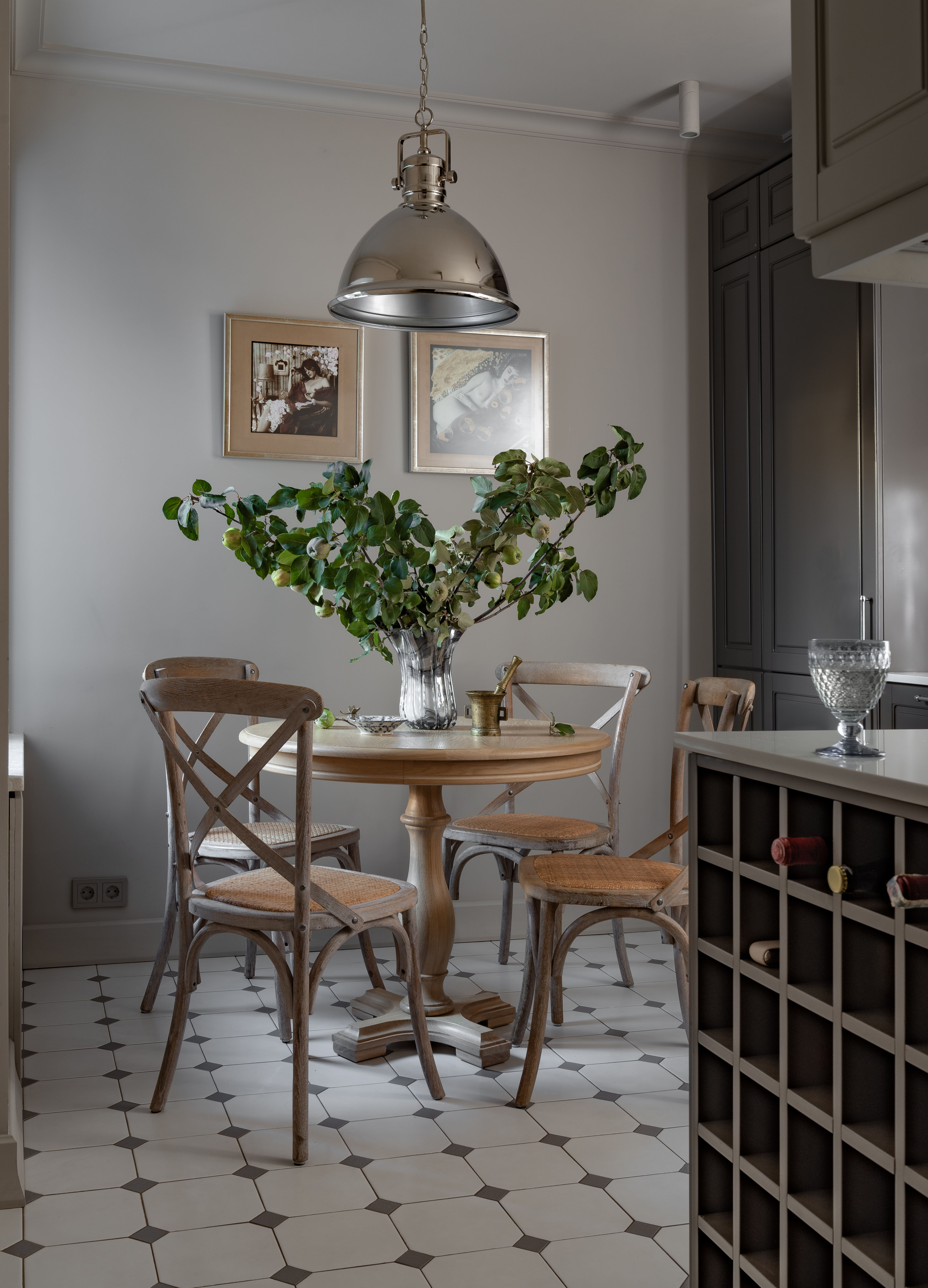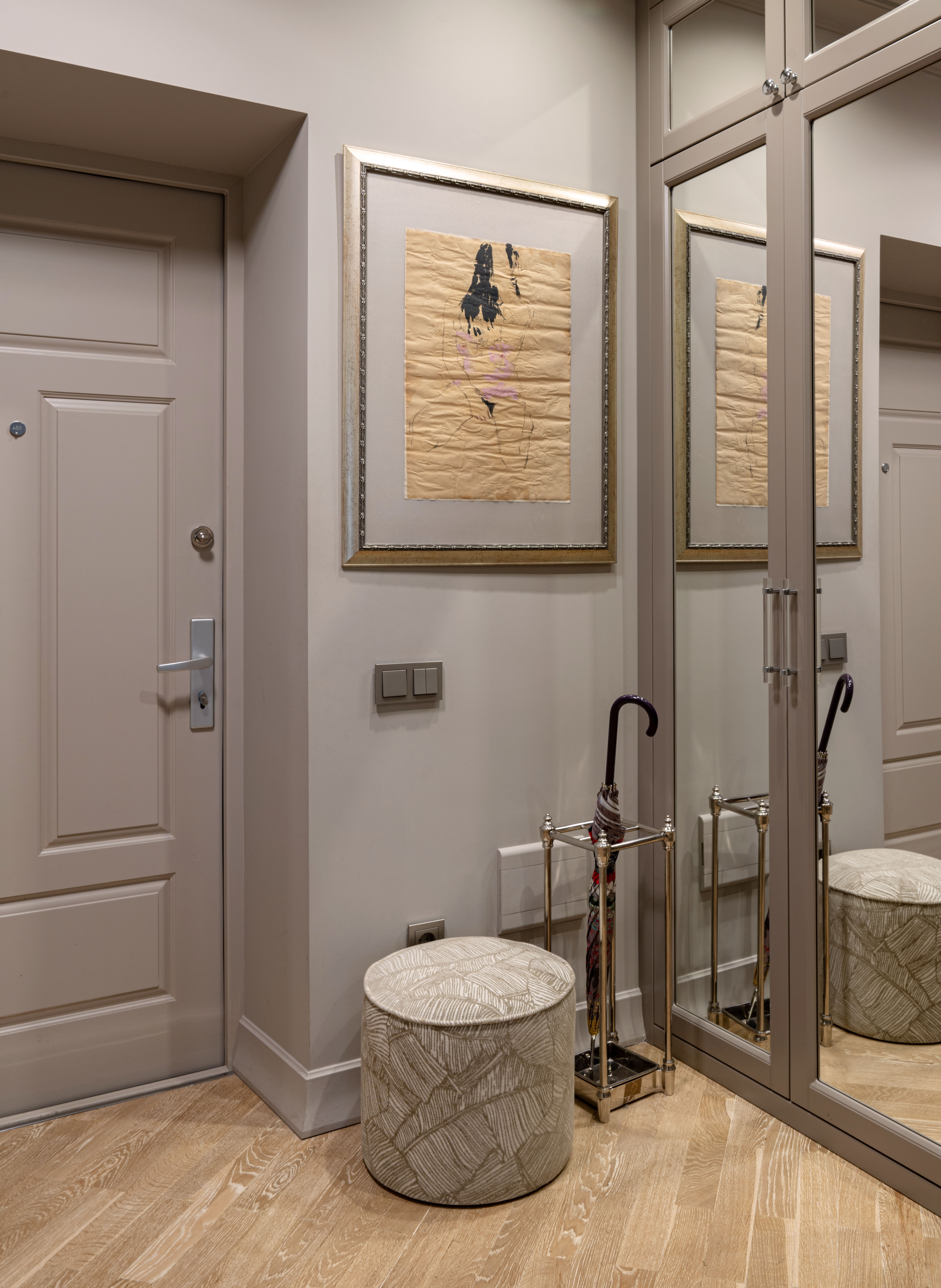 The design of this space was inspired by the color palette of Paris. It harmoniously combines respectability and artistry. Each room has its own color scheme, resembling a painting that blends warmth and coolness. The bookshelf was specially designed for decor items brought from various parts of the world. Ceilings painted the same color as the walls visually increase the height. A collection of paintings adorns the walls, adding elegance to this interior.