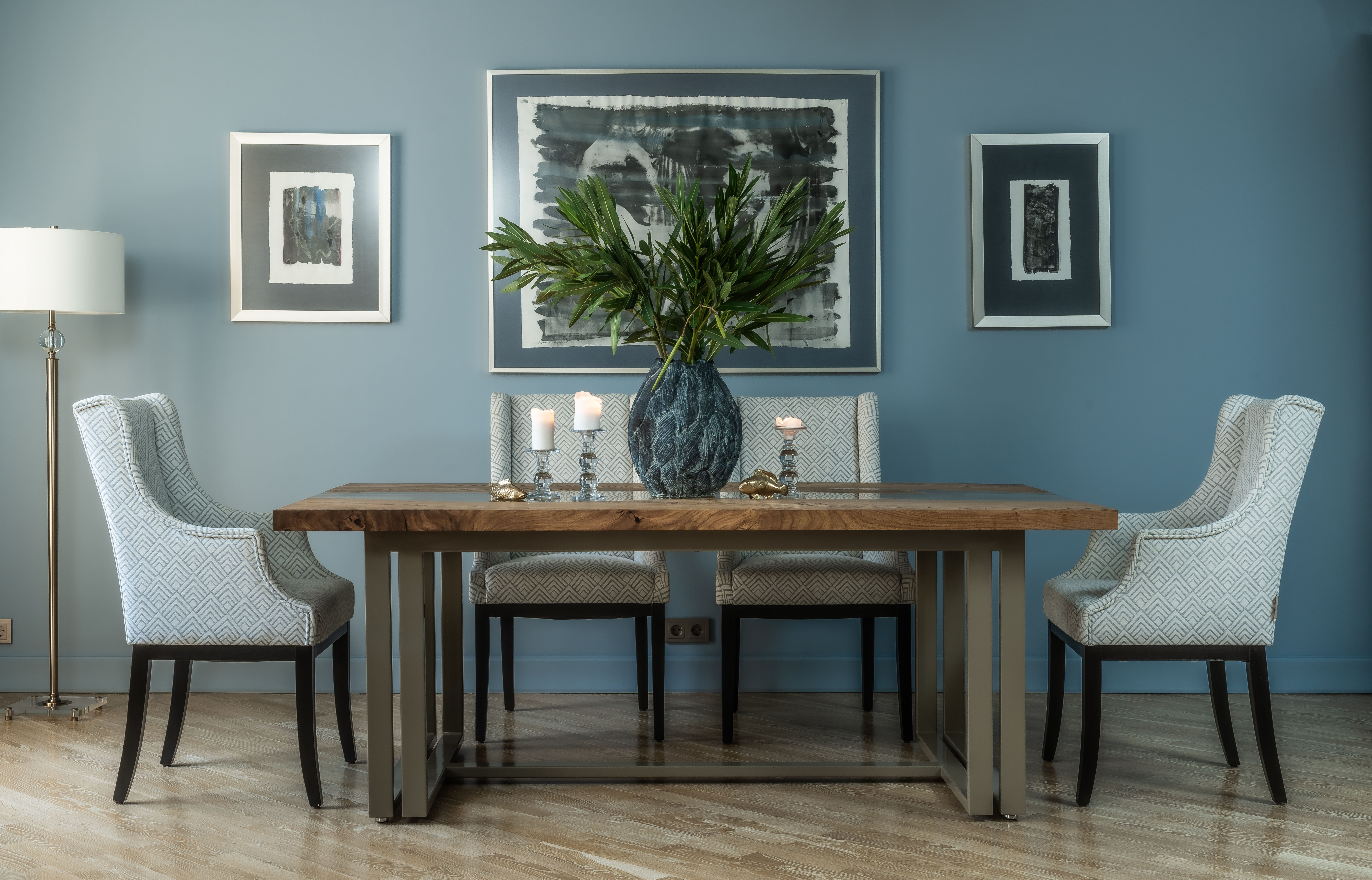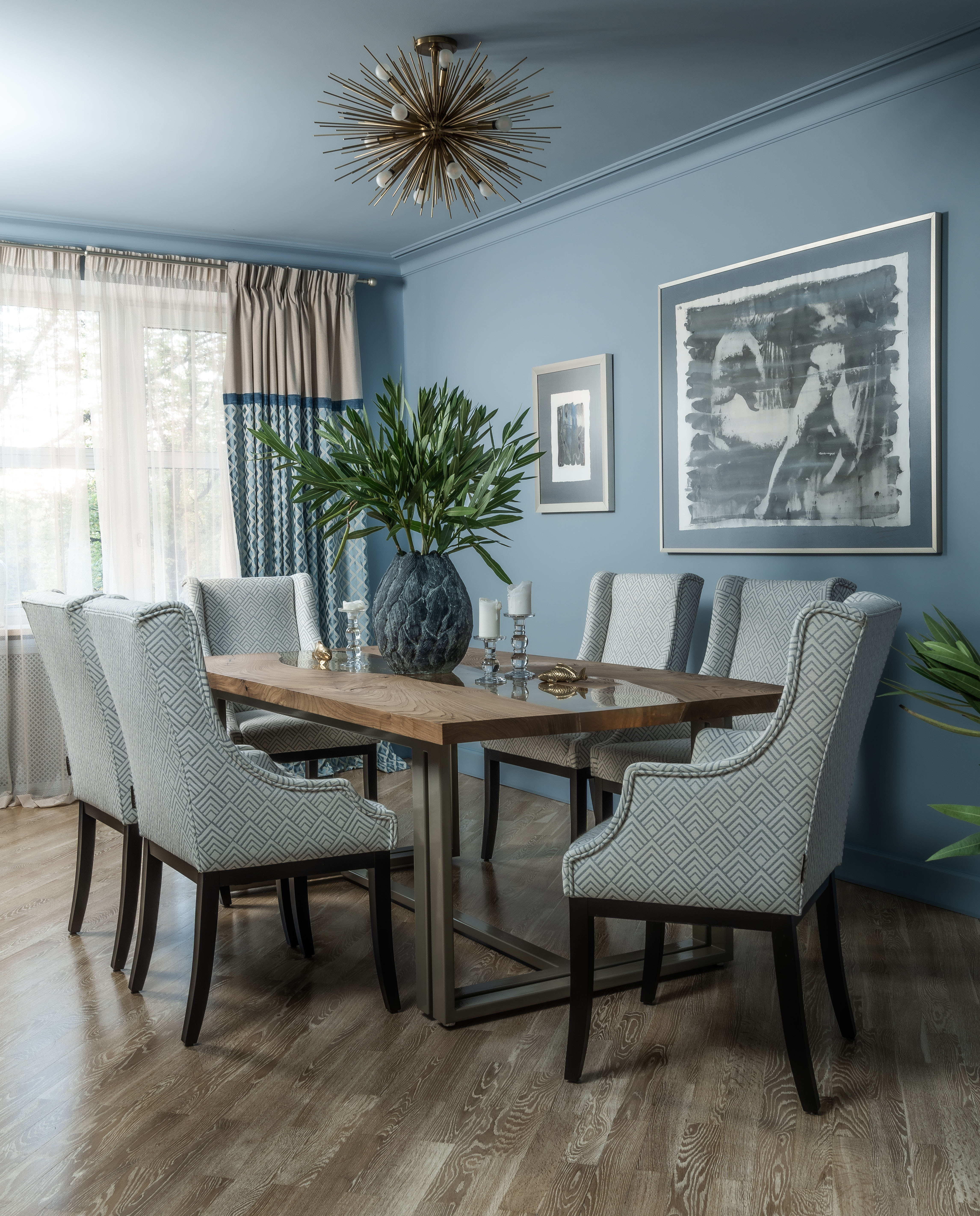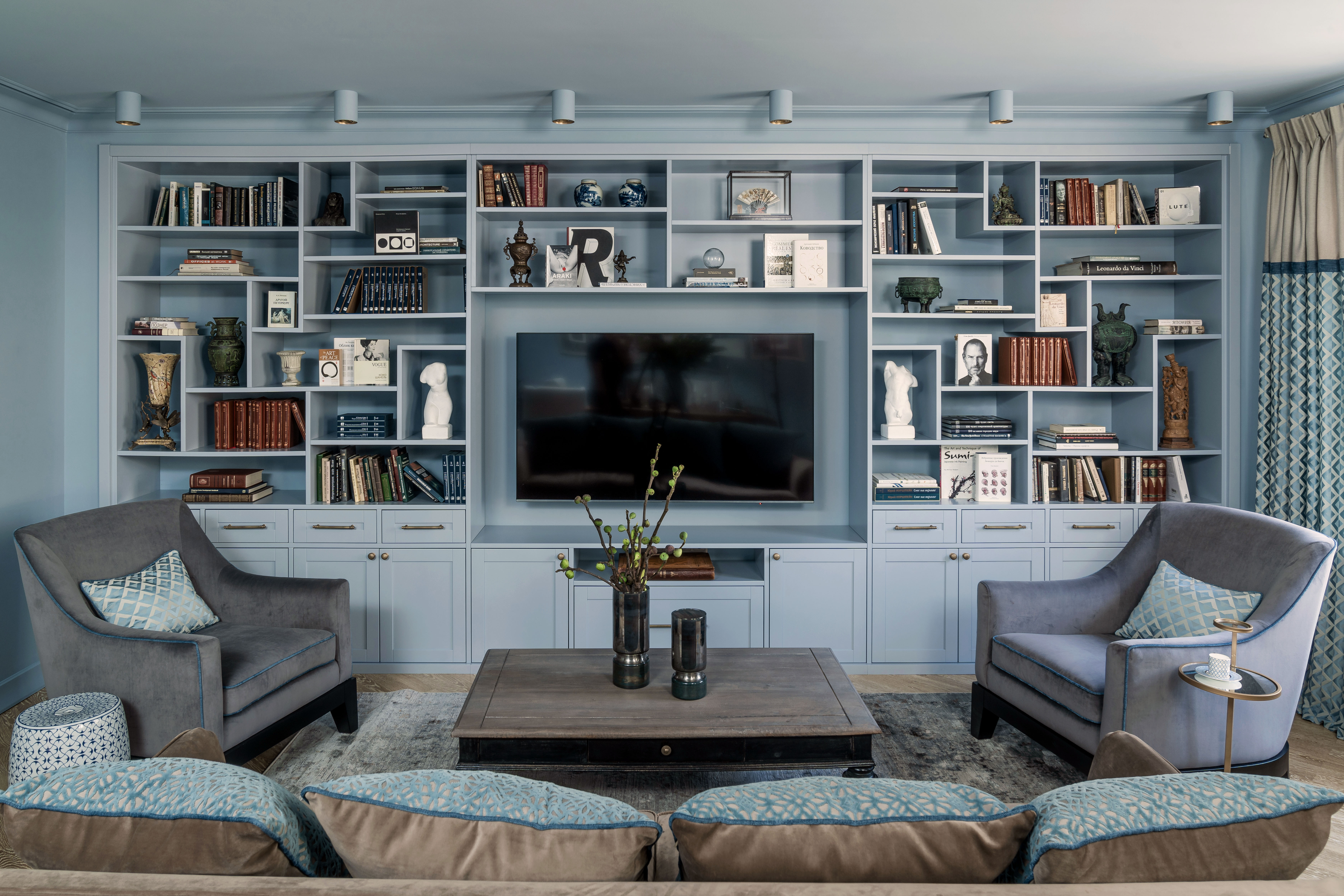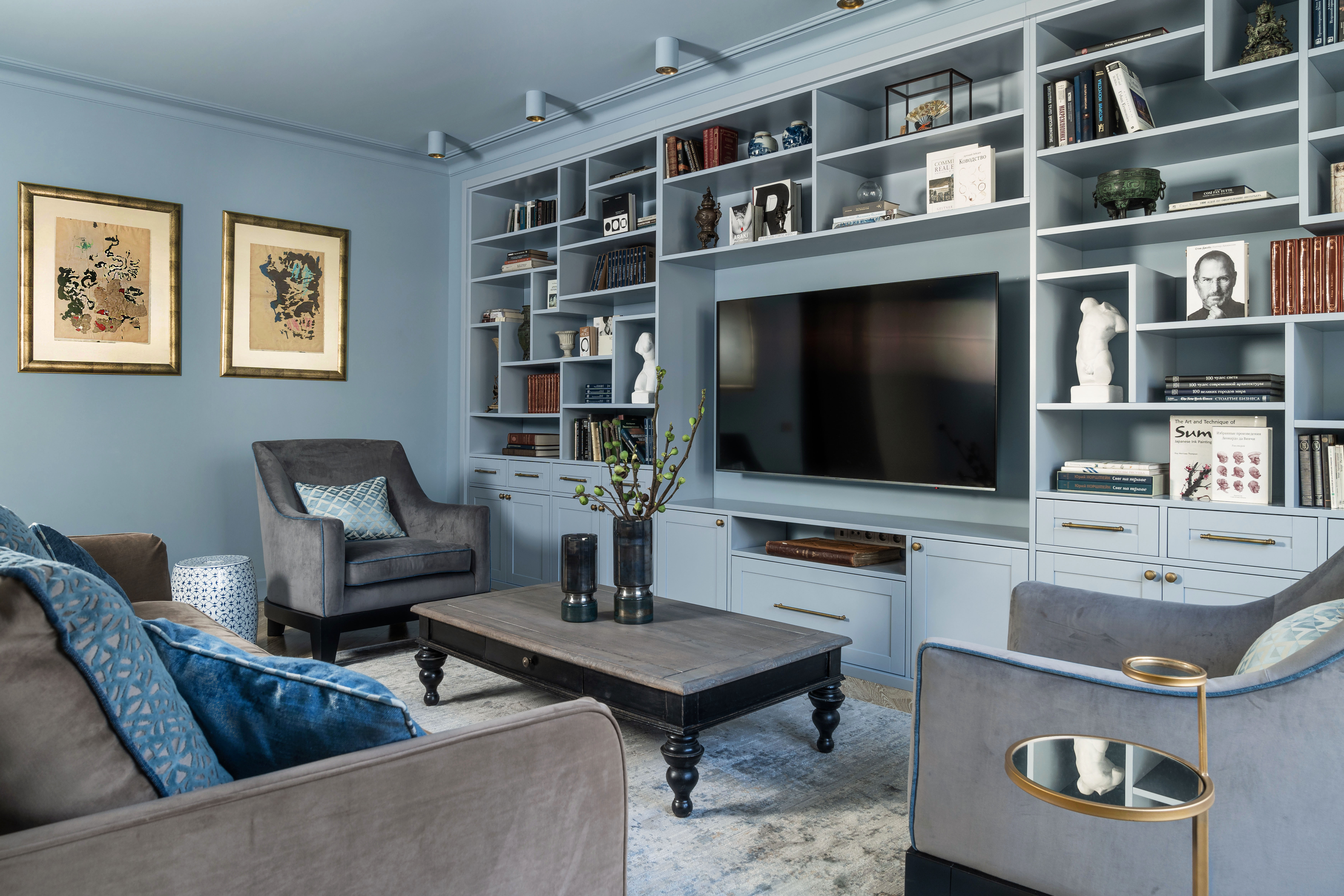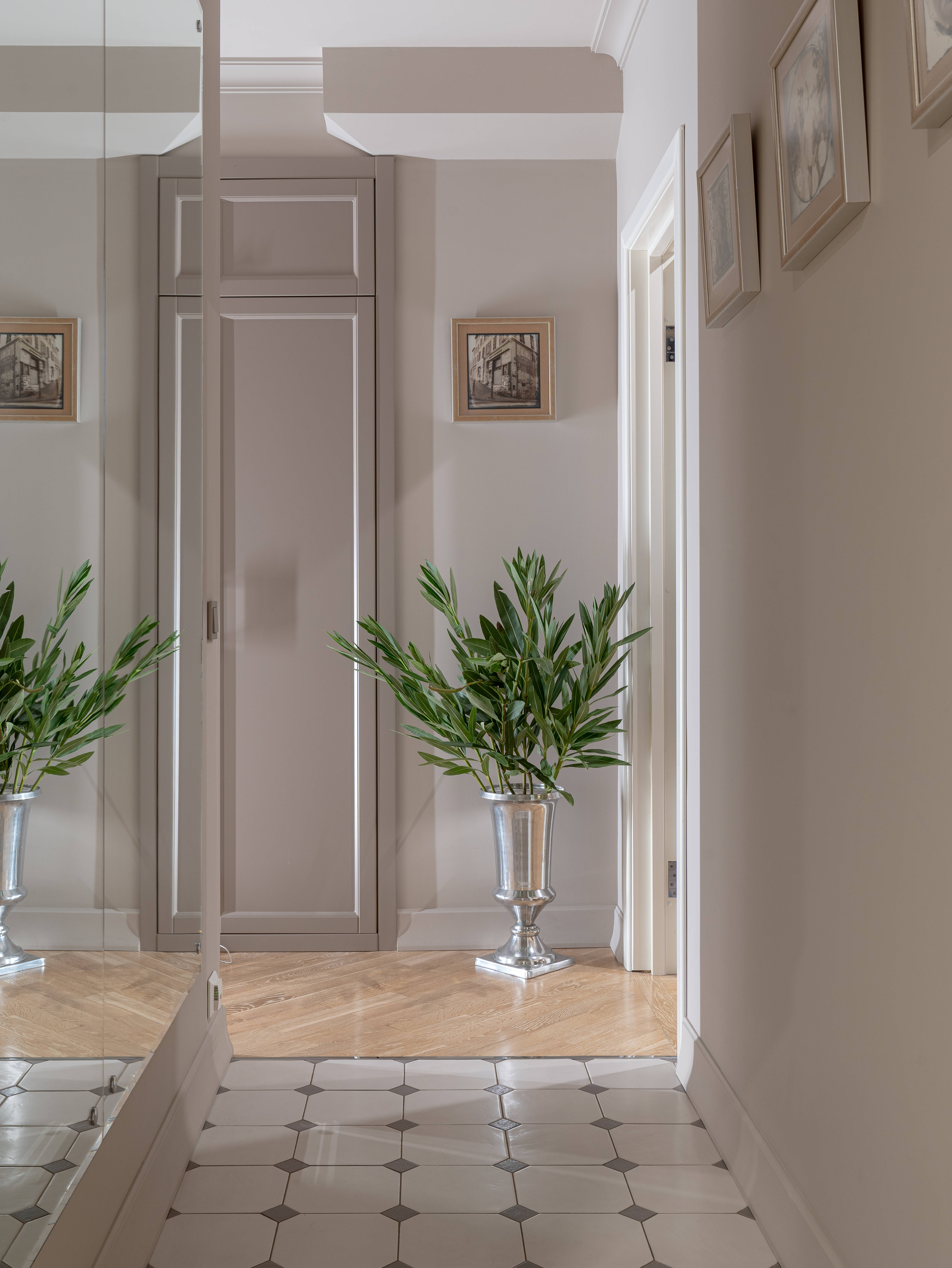 The design of this space was inspired by the color palette of Paris. It harmoniously combines respectability and artistry. Each room has its own color scheme, resembling a painting that blends warmth and coolness. The bookshelf was specially designed for decor items brought from various parts of the world. Ceilings painted the same color as the walls visually increase the height. A collection of paintings adorns the walls, adding elegance to this interior.
